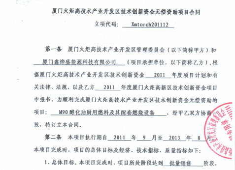 我公司甲醇燃料研发项目荣获 厦门市火炬高技术产业开发区 技术创新 资金扶持